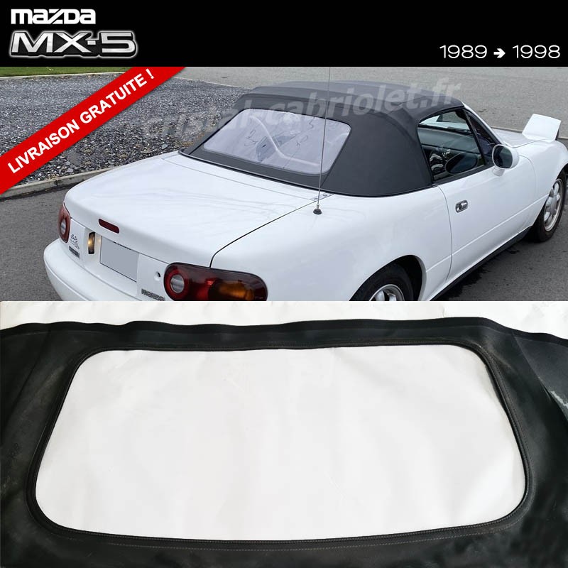 Replacement of your flexible transparent rear window for Mazda MX5 cabriolet (1989 to 1998), made from pressed and polished sheets specially for the automobile of very high quality. Upon receipt of your window + rear part of the hood, I replace the flexible plastic window with a new window (sealing adhesive + seam). Transparency with perfect visibility without disturbance even in inclined vision, anti UV treatment. Very high resistance to cold and heat, no creases during assembly. The plastic meets OEM (Original Equipment Manufacturer) requirements.