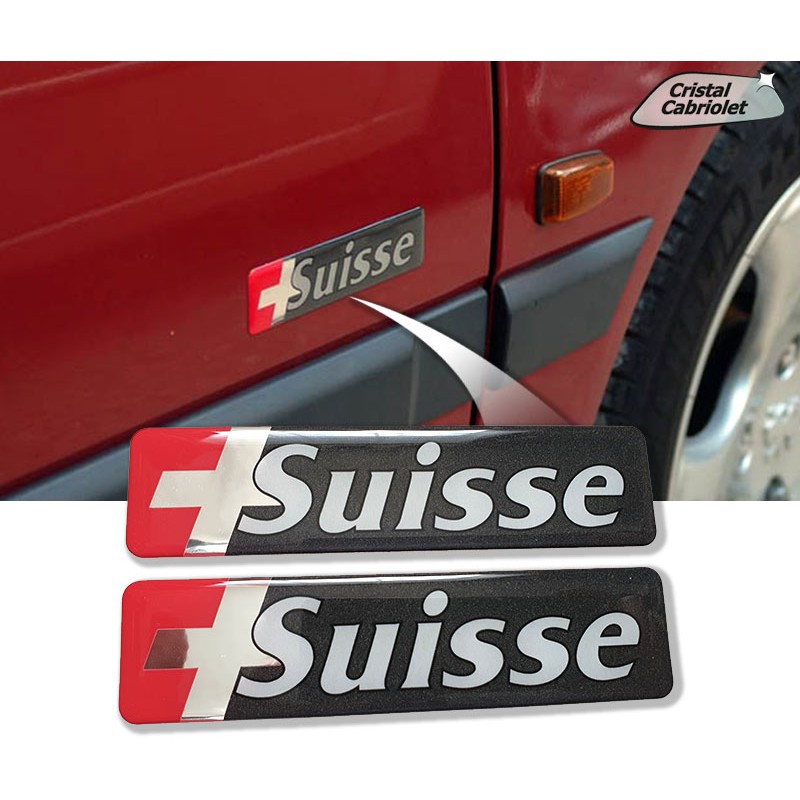Set de 2 stickers SUISSE fond chrome pour portières de Peugeot 306 cabriolet.